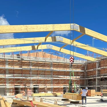 L’intero edificio viene realizzato con struttura portante in cemento armato, scelta che consente di garantire elevati livelli di solidità, sicurezza e durabilità. Particolare rilevanza assume la realizzazione della copertura, progettata con capriate miste in legno e acciaio capaci di coprire luci strutturali oltre i 27 metri, permettendo la creazione di ampi spazi interni completamente liberi da pilastri.